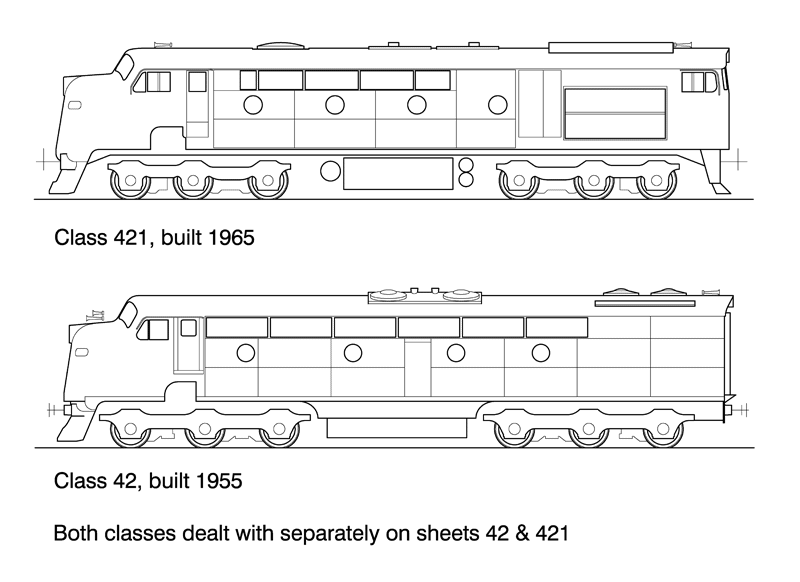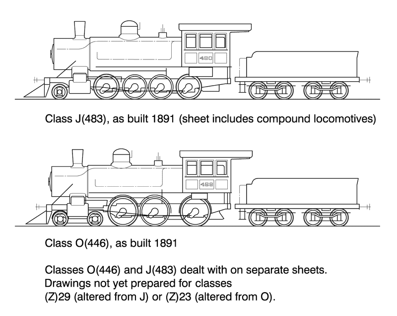 The following Data Sheets are currently available. All are printed at 1:87.1 scale (HO), unless noted otherwise. Each sheet illustrates the locomotive in left elevation, section including right side detail, all end elevations, and a half plan and plan section. Early sheets were hand drawn and include two photographs of the subject locomotive. Sheets produced since 1997 include additional drawings showing both side elevations, variations and alterations, but do not include photographs. These sheets are identified by gold highlighting. To view a simplified thumbnail of each drawing click on the class listing.